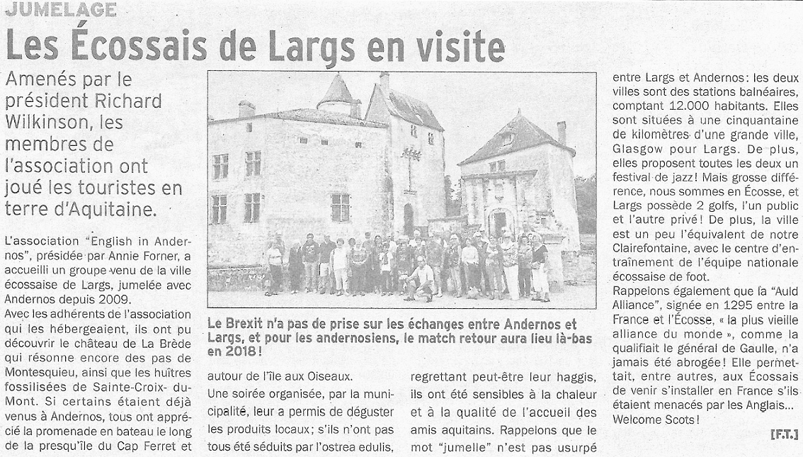 Les Ecossais de Largs nous rendent visite (La Dépèche du Bassin 15/09/2017)